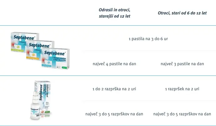 Pastile in pršilo Septabene vsebujejo edinstveno kombinacijo dveh učinkovin, ki s trojno močjo hitro olajša bolečino, blaži vnetje in odpravlja vzrok okužbe že ob prvih znakih bolečega in vnetega grla. Pastile so na voljo v različnih okusih, od najbolj priljubljenega po evkaliptu do toplejših okusov po limoni in bezgu ter po limoni in medu.